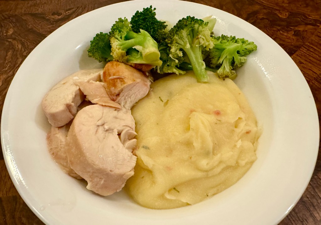 We used instant mashed potatoes to keep from heating up the kitchen. Surprisingly John really likes these potatoes. I prefer my regular preparation of peeling, boiling, and mashing the potatoes with some milk and butter but I am willing to take this short cut. I wouldn’t use them for Thanksgiving dinner but instant mashed potatoes for a ho-hum weeknight dinner is fine.