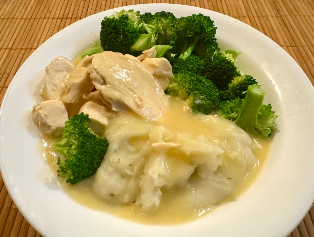 John manned the stove and heated the chicken in gravy on the stove over a low flame. I made the potatoes out of dehydrated potato flakes in the microwave. Finally, and I have never done this before, I microwaved the broccoli.
